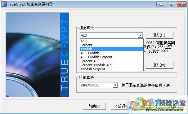 6、設(shè)置加密算法,TrueCrypt提供眾多種類的算法,如果不知道,默認(rèn)就可以了