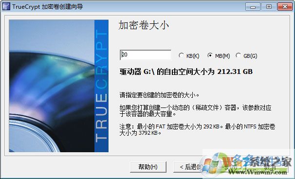 7、設(shè)置加密卷大小,這里填寫的大小就是之后這個保密空間的大小,保密空間不等同于上面提到的保密文件,作者填寫20M,這樣工具就會在硬盤中劃分出20M的空間來用于保存加密文件