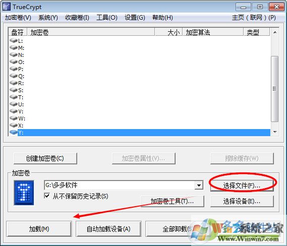 10、還原到TrueCrypt的主界面,點擊“選擇文件”按鈕,選中剛才創(chuàng)建的保密空間文件,再選擇一個“盤符”,圖中的空白區(qū)域中的盤符,作者選擇“N”盤,因為在作者的電腦上沒有N盤,有C、D、E、F、G盤,最后點擊“加載”按鈕