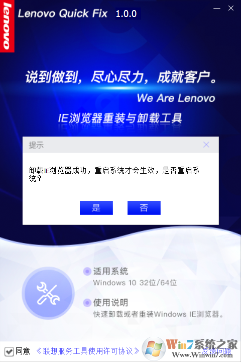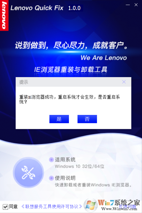 3、點(diǎn)擊圖3“重裝IE瀏覽器”按鈕,操作成功將彈出提示。如圖5: