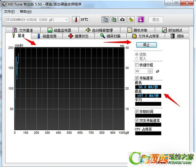 1、如果買了一個新的硬盤可以通過基準(zhǔn)功能測試一下硬盤的讀寫速度,讀寫測試是單選的請注意選擇。值得注意看的是最低的速度和最高的速度