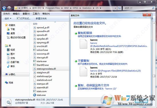 5、將安裝包“crack”目錄下的許可文件“lservrc”復制到安裝目錄下覆蓋源文件即可,默認安裝目錄為C:\Program Files\IBM\SPSS\Statistics\25\