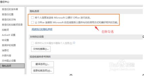 7、網(wǎng)上其他方法也都可以結(jié)合起來用,【例如把“信任中心-信任中心設(shè)置-隱私選項(xiàng)”里兩個(gè)選項(xiàng)去除勾選】。