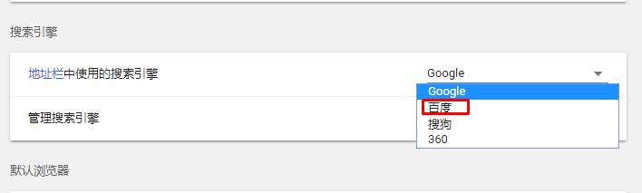 2、在搜索引擎設(shè)置中,把地址欄中合犭的搜索引擎改成百度;