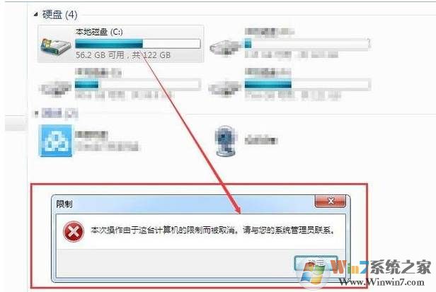 4、最后設(shè)置完成我們點(diǎn)擊電腦C盤,將出現(xiàn)限制提示 C盤也就無法打開了。如圖:
