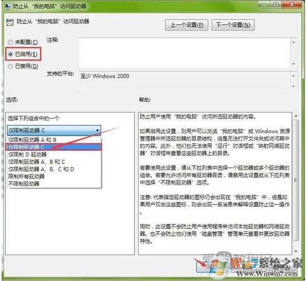 3、雙擊打開后,在新的窗口點(diǎn)擊選擇“已啟用”。接著在選項(xiàng)欄下拉選擇“僅限制驅(qū)動(dòng)器C”。選擇完成后,點(diǎn)擊確定保存即可。如圖: