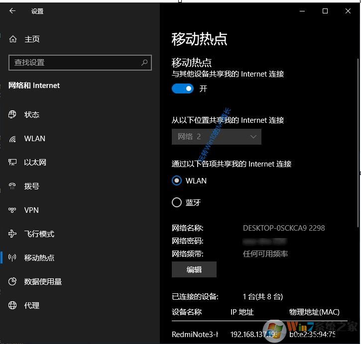 1、進(jìn)入“Windows設(shè)置 - 網(wǎng)絡(luò)和Internet - 移動(dòng)熱點(diǎn)”設(shè)置界面。如圖: