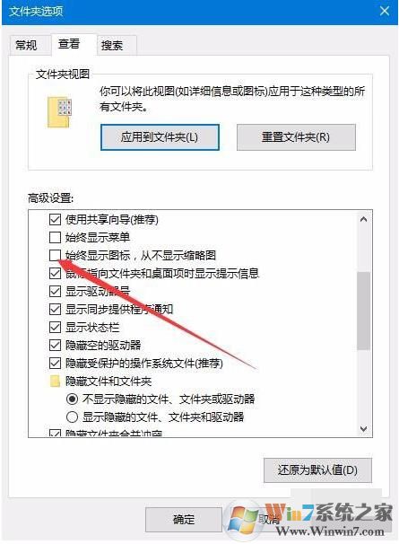 4、在打開的查看頁面中,我們找到“高級設(shè)置”框中的“始終顯示圖標(biāo),從不顯示縮略圖”一項,并勾選前面的復(fù)選框