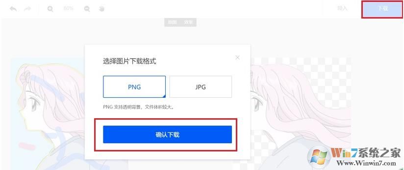 5、摳圖完成后,點(diǎn)擊右上角的“下載”,默認(rèn)保存的是PNG格式,只有這種格式才支持圖片透明,直接點(diǎn)擊下方的“確認(rèn)下載”即可,如圖所示。
