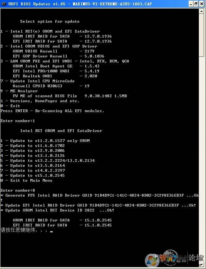 3、下載UEFI BIOS Updater 1.65程序,用于升級老主板BIOS中的RST OROM版本,下載后解壓縮得到一個名為UBU_v1_65的文件夾。以我的華碩MAXIMUS-VI-EXTREME主板為例,1603版本的BIOS文件名為MAXIMUS-VI-EXTREME-ASUS-1603.CAP,把該文件拷貝到UBU_v1_65文件夾中,運行UBU.Bat批處理文件,會彈出如下圖的程序窗口。在第一個選項中填入數(shù)字1進入RST OROM升級菜單,然后填入數(shù)字8把RST OROM升級到V15.1.0.2545,然后保存文件退出。