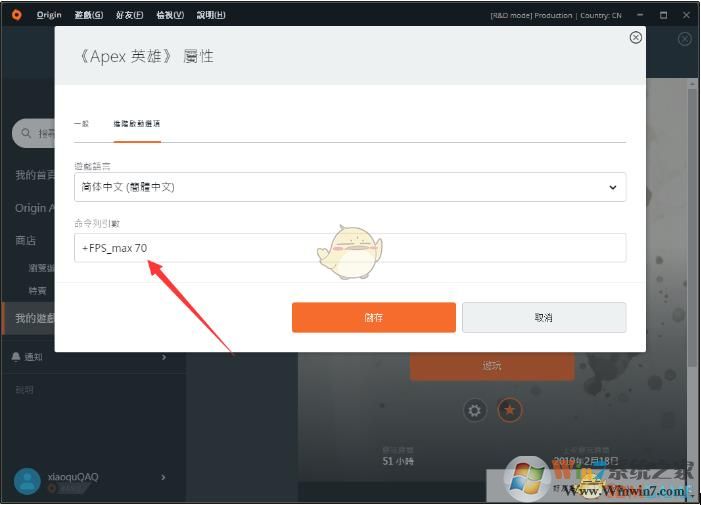 2、讓后打開橘子平臺,到APEX游戲 齒輪 按鈕 游戲?qū)傩?命令列引數(shù) 輸入 (+FPS_max 100)不帶括號后面的數(shù)字可以調(diào) 100以內(nèi)都可以,具體按照你游戲時的FPS來設(shè)定。