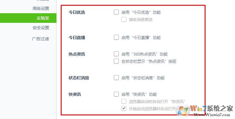 3、這時(shí)我們就可以看到很多360的廣告設(shè)置選項(xiàng)了,把下面的這些選項(xiàng)全部取消勾選。
