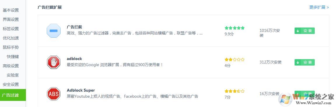 如上圖,在廣告過(guò)濾欄目安裝廣告過(guò)濾插件就可以了。
