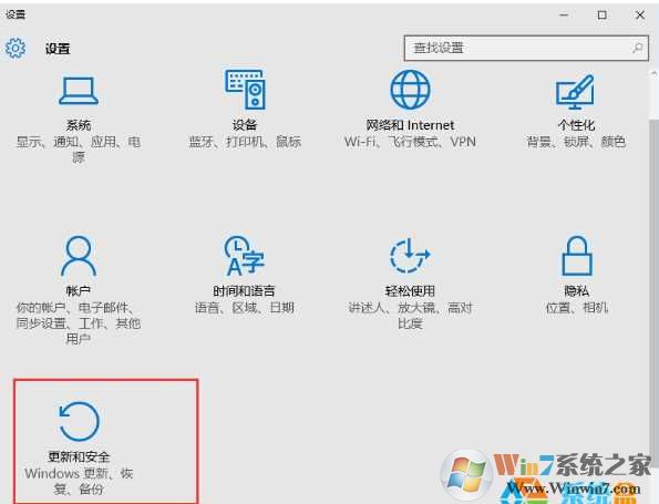 2、打開系統(tǒng)設(shè)置后,找到并點擊“更新和安全”選項,如下圖所示: