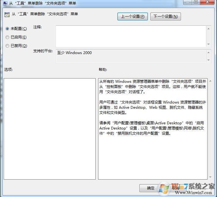 4、在屬性對話框中切換到“設置”標簽頁,你會發(fā)現該屬性選項已選中了“已啟用”單選項,所以屏蔽了“文件夾選項”。這時你只要把該選項設置為“未配置”或“已禁用”即可,最后點擊“確定”按鈕,就能找回“文件夾選項”了。