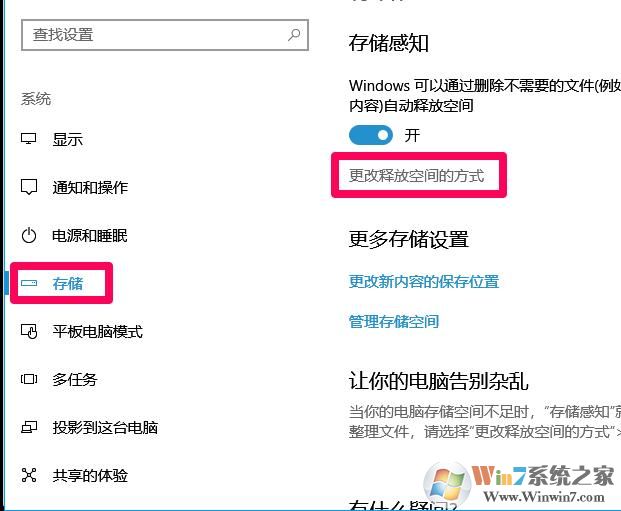 3、選擇左側(cè)的“存儲”,點擊“更改釋放空間的方式”