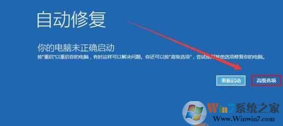 2、重復(fù)步驟3次左右啟動后出現(xiàn)“自動修復(fù)”界面,我們點擊 高級選項 進入;