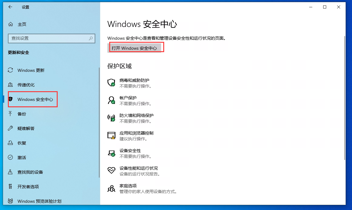 3、進入“更新和安全界面”后點擊“Windows安全”—“打開Windows Defender安全中心”,打開Windows Defender安全中心主頁。