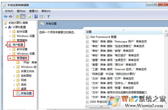 2、依次展開用戶配置→管理模板→所有設(shè)置,如圖所示: