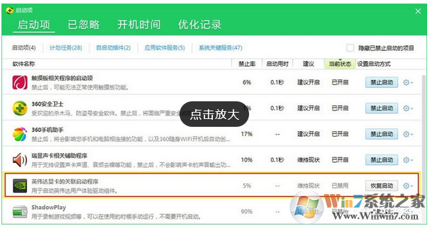 三、打開優(yōu)化軟件,在開機(jī)啟動(dòng)項(xiàng)中開啟有關(guān)于NVIDIA 的所有啟動(dòng)項(xiàng)和服務(wù)。