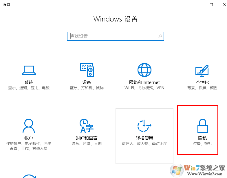 1、win+i組合鍵喚出windows設(shè)置,在設(shè)置選項(xiàng)中點(diǎn)擊“隱私”。如圖所示: