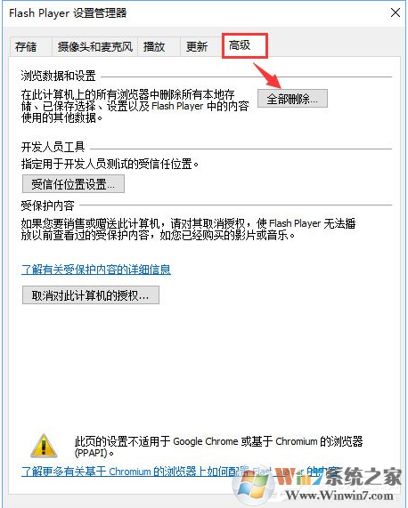 3、在Flahs Player 設(shè)置管理器框中切換到高級(jí)選卡,在瀏覽數(shù)據(jù)和設(shè)置下點(diǎn)擊全部刪除按鈕;