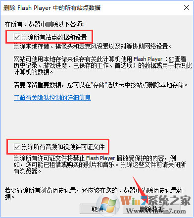 4、在刪除 Flash Player 中的所有站點(diǎn)數(shù)據(jù)框中,勾選刪除所有音頻和視頻許可證文件以及刪除所有站點(diǎn)數(shù)據(jù)和設(shè)置(默認(rèn)已勾選),最后點(diǎn)擊刪除數(shù)據(jù)。