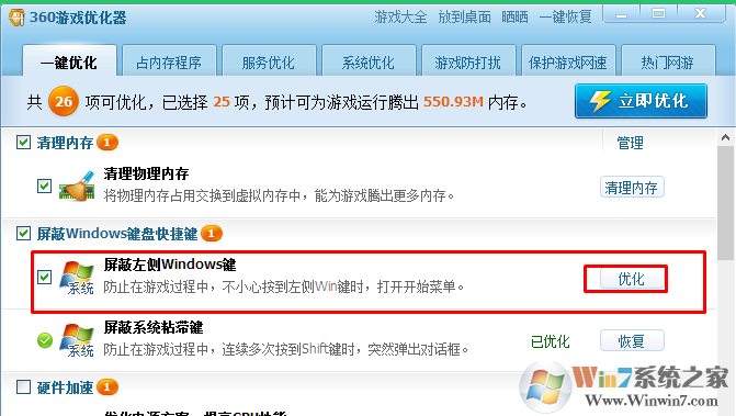提示:游戲youh優(yōu)化器中還有很多我們可以利用的優(yōu)化項目,看自己習慣選擇優(yōu)化即可。游戲完之后點擊恢復即可恢復win鍵使用。