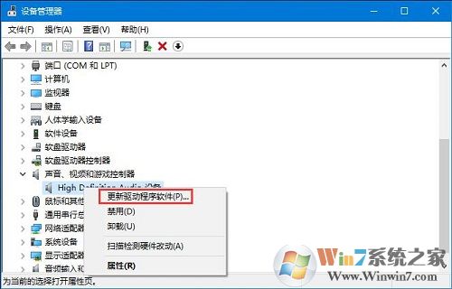 2、展開“聲音、視頻和游戲控制器”,在下面的聲卡上單擊右鍵,選擇“更新驅(qū)動(dòng)程序軟件”進(jìn)行更新驅(qū)動(dòng);win10系統(tǒng)會(huì)自動(dòng)為我們選擇最佳的驅(qū)動(dòng)更新。