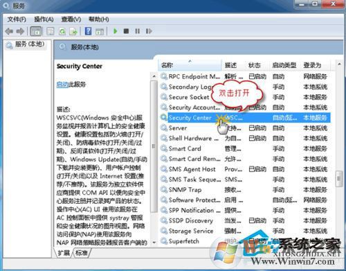 3.找到 Security Center 服務(wù),雙擊它打開服務(wù)屬性。