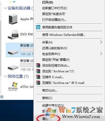1、使用win+e打開資源管理器,選擇對應的盤符,右鍵點擊,在菜單中選擇屬性,如下圖所示: