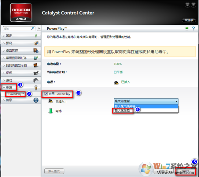 3、點擊“電源”--“PowerPlay”--“啟用PowerPlay”--“最大化性能”;