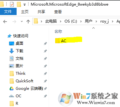 2、打開文件夾,定位到 C:\用戶\您的用戶文件夾\AppData\Local\Packages 這個(gè)目錄下,找到Microsoft.MicrosoftEdge_8wekyb3d8bbwe這個(gè)目錄,如下圖: