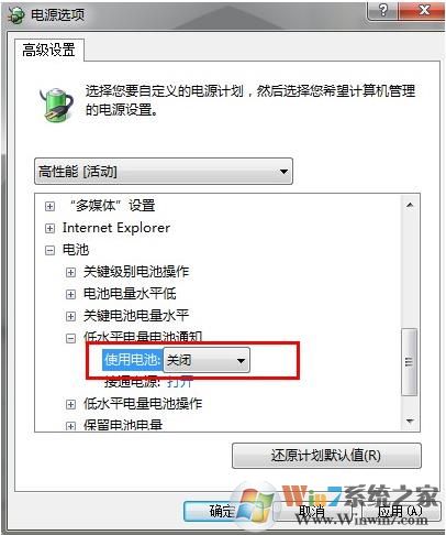 3、展開“電池→低水平電池電量通知”,將“使用電池”設為“關閉”(如圖),