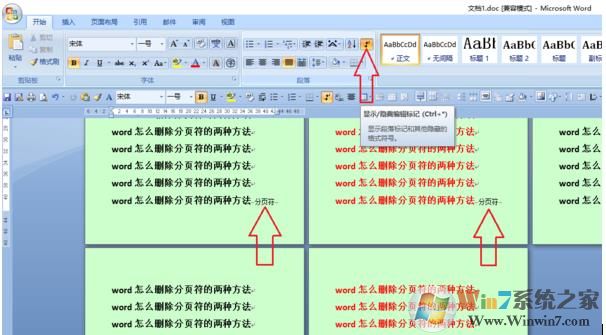 1.打開word文檔,單擊“開始”菜單下的“顯示/隱藏編輯標(biāo)記”命令按鈕,使分頁符顯示,如下圖: