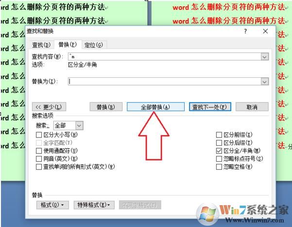 3.在“查找和替換”對(duì)話框中單擊“替換為”右側(cè)的輸入框,單擊“全部替換”按鈕,如下圖: