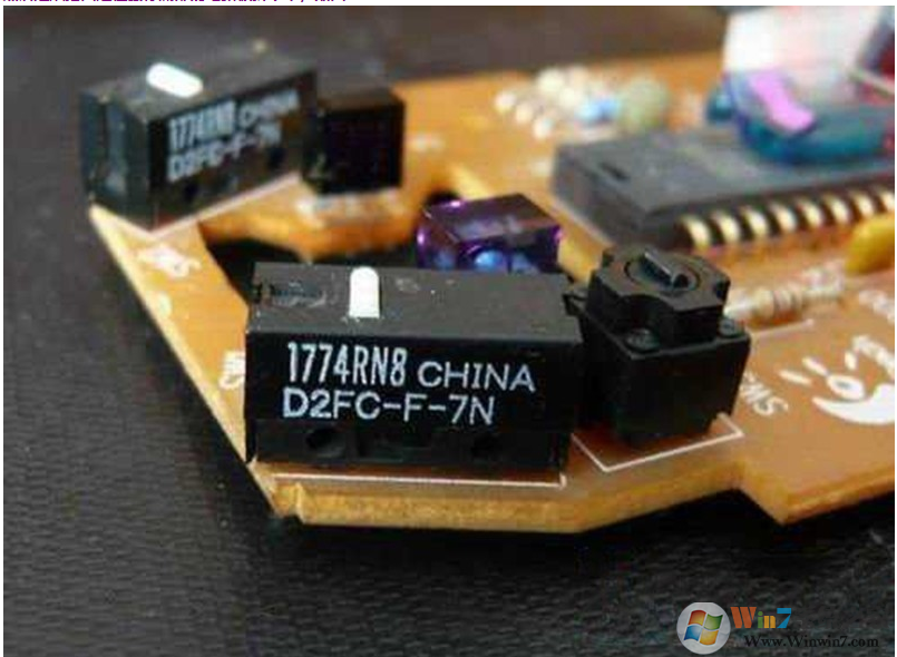 前邊已經(jīng)提到了微動(dòng)開(kāi)關(guān),微動(dòng)開(kāi)關(guān)就是鼠標(biāo)左右鍵的按鈕。平時(shí)我們點(diǎn)擊鼠標(biāo)發(fā)出來(lái)清脆的嗶嗶聲就是這個(gè)微動(dòng)開(kāi)關(guān)發(fā)出來(lái)的,如圖: