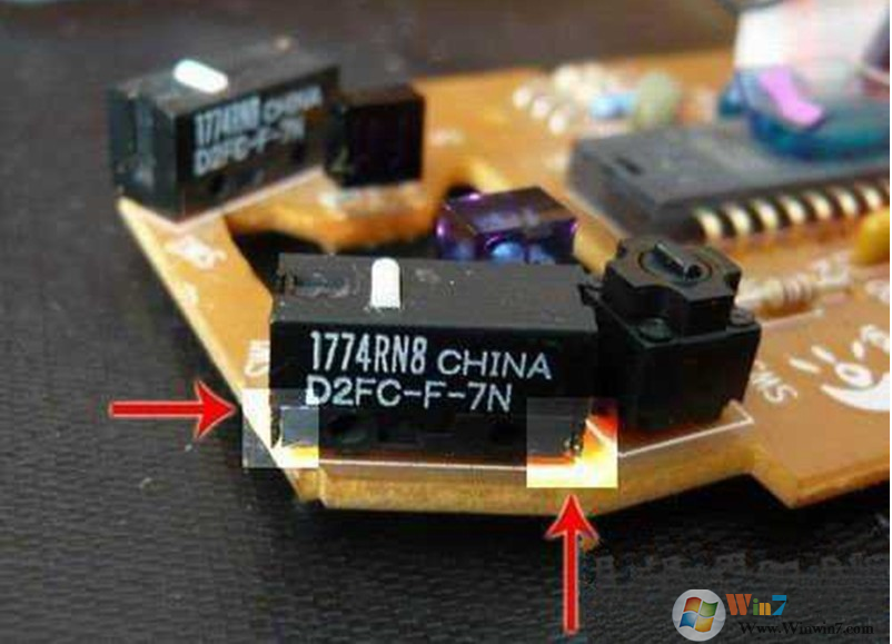 這里是關(guān)鍵點(diǎn)了。如果鼠標(biāo)的按鍵失靈,或者單擊變雙擊,那么圖中圓圈處的白色條塊應(yīng)該會(huì)變成灰色或者黑色(被氧化了),用一字螺絲刀,或者小金屬片之類(lèi)的刮幾下,讓它恢復(fù)原來(lái)的亮白色即可。