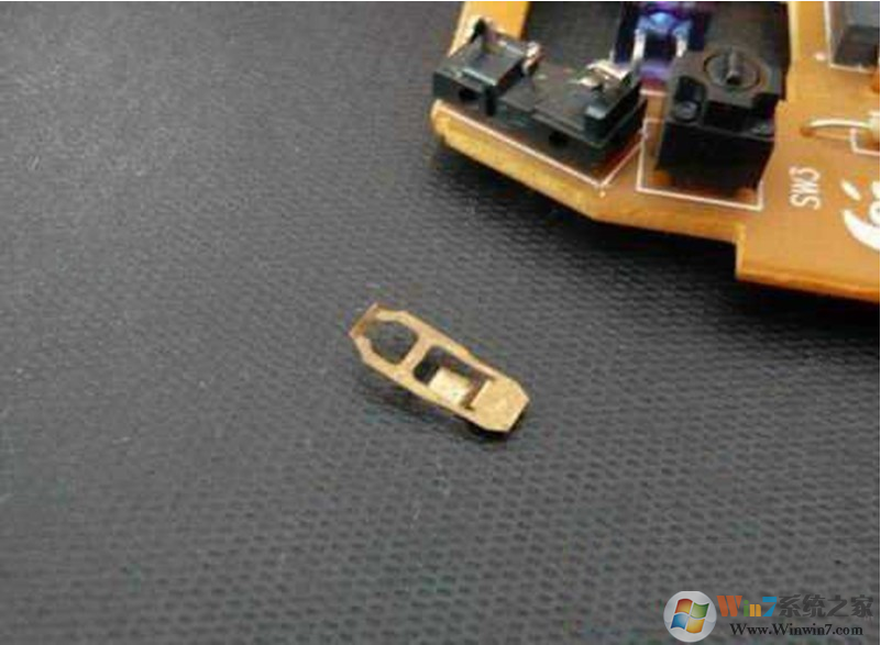 拆下的金屬片。(如果發(fā)現(xiàn)微動(dòng)開(kāi)關(guān)外殼或這個(gè)金屬片已經(jīng)完全損壞,那就只有更換新的微動(dòng)開(kāi)關(guān)了,這個(gè)需要電烙鐵才能更換。如果你的鼠標(biāo)本來(lái)就很便宜的話(huà)建議直接換新鼠標(biāo),反之,可以拿到維修店去,讓維修師傅給你換,一般一、二十元就搞定了)