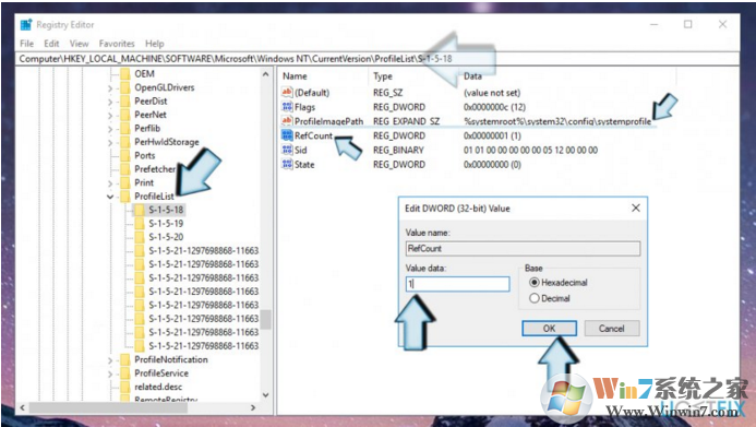 - 在RefCount鍵上單擊兩次,并將其值從1更改為0,然后單擊確定。