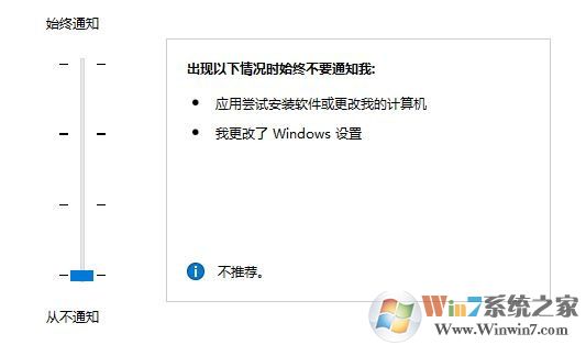4、在彈出的用戶賬戶控制設(shè)置,將滑塊移動(dòng)到最底部,點(diǎn)擊確定保存設(shè)置即可!