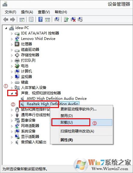 2、在設(shè)備管理器界面,展開“聲音、視頻和游戲控制器”,在“Realtek High Definition Audio”上點擊鼠標右鍵,選擇”卸載”,如圖所示: