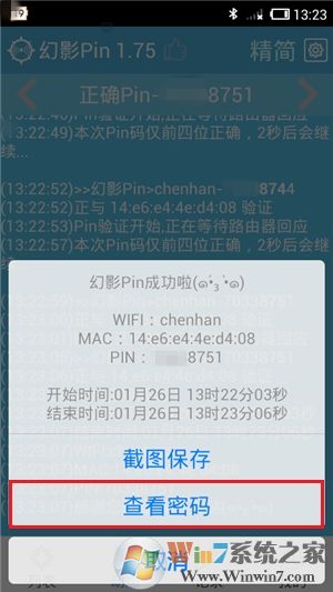 為有效縮短時間并提高效率,軟件會對8位Pin數(shù)值的前后4位,同時依次分段進行遞增和遞減的嘗試,當Pin的前4位正確后會發(fā)出聲音提醒,此時軟件將前4位固定,并繼續(xù)依次嘗試后4位數(shù)字。若已找到正確的Pin碼并成功連接熱點,將立即停止破解并發(fā)出聲音和推送通知,軟件還會彈出破解成功的提示,此時點擊“查看密碼”或切換到“記錄”頁面中,即可查看該熱點的PIN碼及無線密碼,若以后熱點主人突然修改了無線密碼,也可在軟件中直接輸入該PIN碼,再次嘗試破解連接并重新獲得密碼。