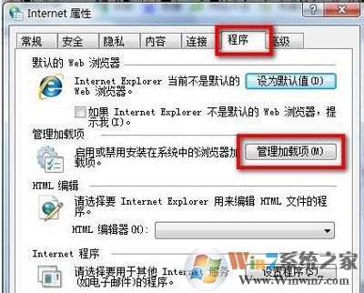 2、接下來彈出的是IE瀏覽器的設置窗口,選擇“程序”—“管理加載項”;