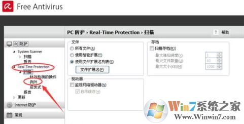 步驟2、打開小紅傘配置界面找到,real-time -protection -----掃描----列外菜單 設(shè)置,如圖: