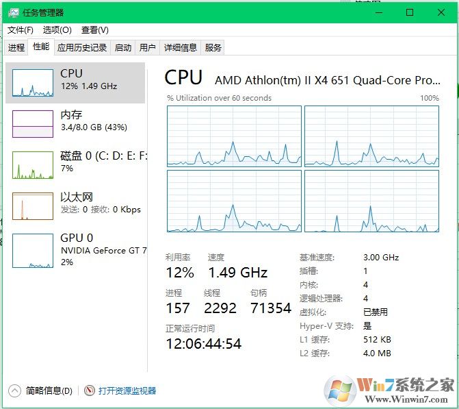 性能界面下,我們可以看見(jiàn)詳細(xì)的硬件使用情況,可以用以判斷自己的系統(tǒng)硬件是否使用正常和是否需要升級(jí)該硬件。具體判斷數(shù)值大家可自行百度。