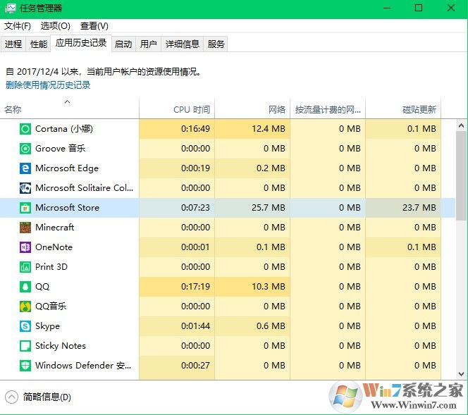 在應(yīng)用歷史記錄下,我們可以看到所有軟件在本次啟動(dòng)中對(duì)cpu和網(wǎng)卡流量的使用情況。這一點(diǎn)對(duì)于節(jié)能和使用移動(dòng)網(wǎng)卡的用戶非常的有用。對(duì)于流量非常大的軟件我們提前將其結(jié)束即可。