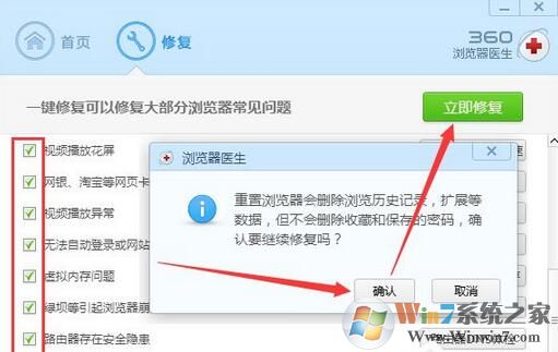 2、點(diǎn)擊【修復(fù)】,將下面所有選項(xiàng)勾選,同時(shí)需要勾選底部的【瀏覽器功能異?!?,點(diǎn)擊立即修復(fù)即可!