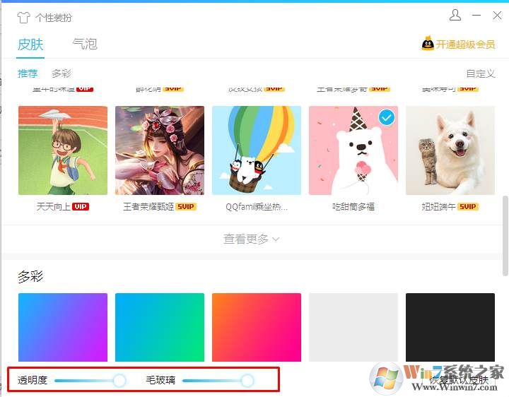 2、選擇一張你喜歡的QQ皮膚主題,然后把下面的 透明度 和毛邊玻璃都設置一下,就可以看到效果了。