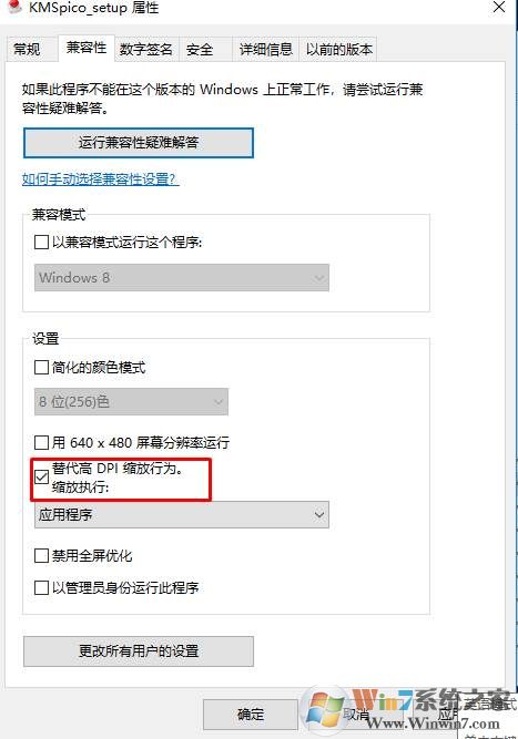 6、如果設(shè)置DPI之后,想某個(gè)軟件的Dpi不隨之變化,那么右鍵軟件——屬性——兼容性下勾選“替代高DPI縮放行為”選項(xiàng),確定即可。